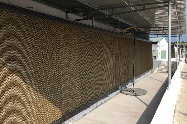 Beide zijden van de stal zijn uitgevoerd met gordijnen voor natuurlijke ventilatie die alleen voor noodgevallen geopend worden.